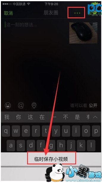 3、拍摄完成后,点击界面顶部的“…”,在底部弹出的菜单中点击“临时保存小视频”就可以了。