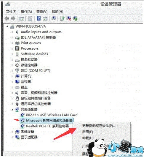 2、在设备管理器下面点击网络适配器再找到[Microsoft 托管网络虚拟适配器],在上面点右键再点启用;