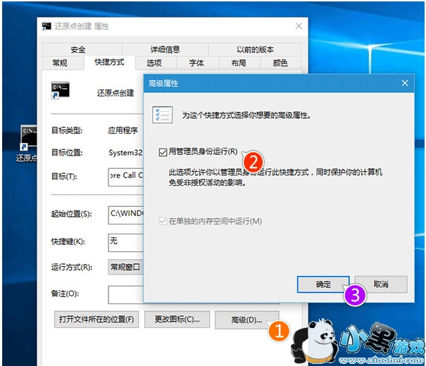 5、在“快捷方式”选项卡中点击“高级...”,勾选“用管理员身份运行”,点击“确定”按钮完成(如上图)