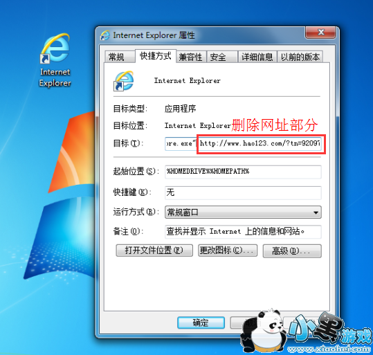 (1)鼠标右键点击桌面上的浏览器快捷方式(图示IE浏览器),点击属性打开,查看目标,如果发现异常网址,直接删除,然后点击确定。