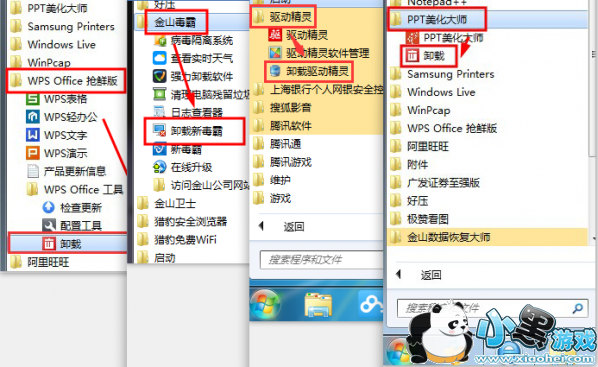 开始菜单—所有程序,找到各个软件的文件夹进行卸载 ,如图: