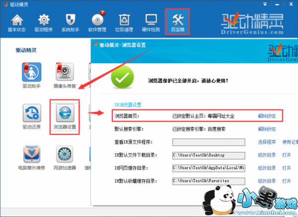 不想卸载驱动精灵,打开驱动精灵-百宝箱-浏览器保护-解除主页锁定并锁定2345,如图: