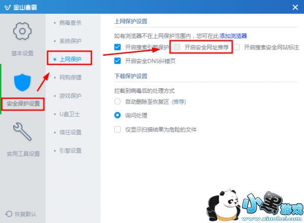 解决方法:在毒霸设置页面,安全保护设置-上网保护,取消安全网址推荐的勾选。