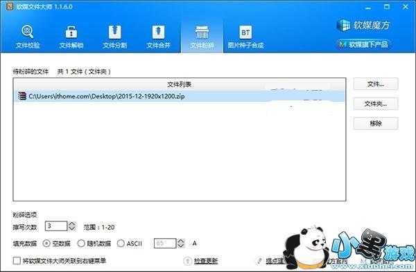 是不是非常简单?另外,如果你的文件还没有被人为删除,可使用软媒魔方中的文件大师对其进行粉碎,文件大师同样会使用随机、空白等数据对文件进行擦写,这在需要对于单个文件进行擦除时效率要更高。如下图所示: