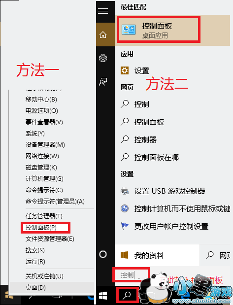左键点击“开始”按钮,找到“控制面板”,或者用搜索栏直接输入控制面板,直接打开控制面板选项: