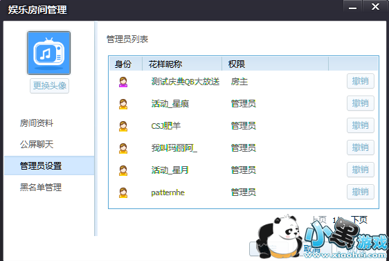 点击房间左上角房间管理,在弹出的房间管理面板中的管理员设置页面,可看到此房间的管理员列表,房间主人可在此处撤销管理员。