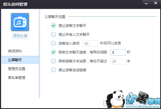 在房间管理中,管理员可以对公屏聊天进行设置,设置项见下图。