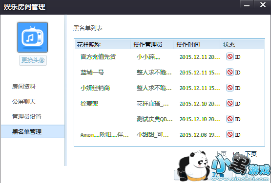 房间管理中,群主和管理员对房间黑名单用户进行操作中。