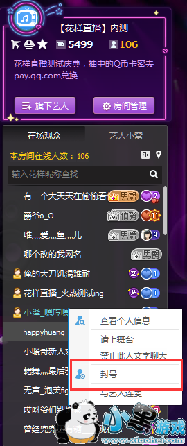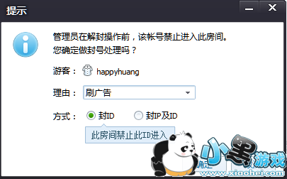 在房间面板的成员列表区域选中某个用户后,在鼠标右键点击出现的管理区域中,将某人封号;支持封id和封ip及id;被封号的用户则被加入该房间的黑名单;