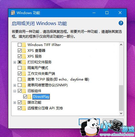 2、在Windows功能中找到“旧版组件”,展开,勾选“DirectPlay”功能,点击“确定”;