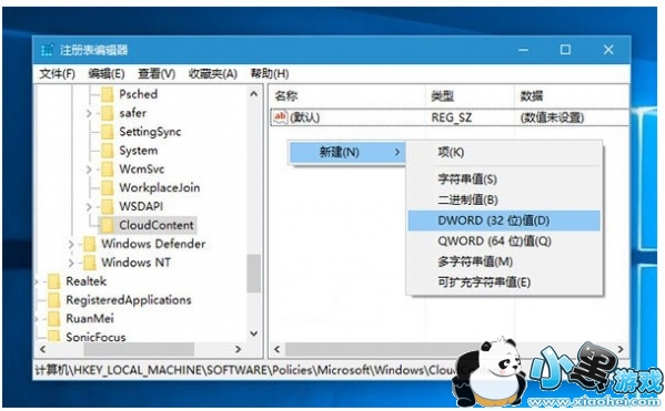 4、选中CloudContent项,在右侧新建名为DisableWindowsConsumerFeatures的DWORD(32位)值,如下图所示: