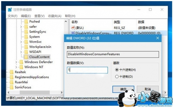 5、双击DisableWindowsConsumerFeatures,将其值设置为1,然后保存。