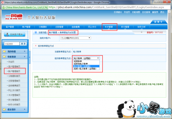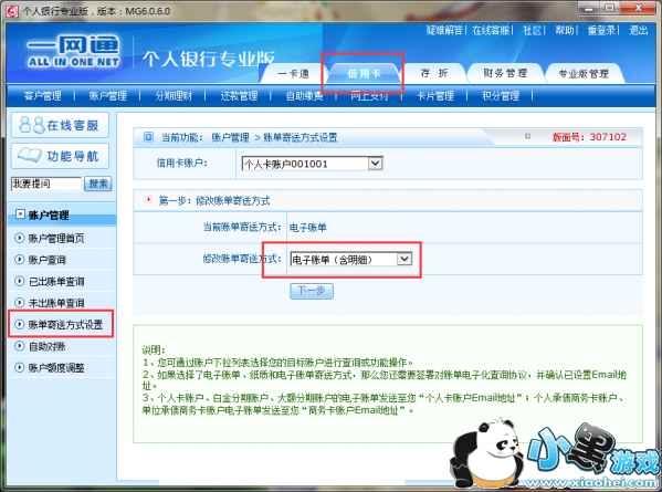 登陆网上银行大众版,进入“账户管理” -》 “账单寄送方式设置”,然后选择“电子账单(含明细)“,如下图所示: