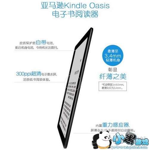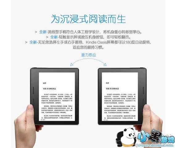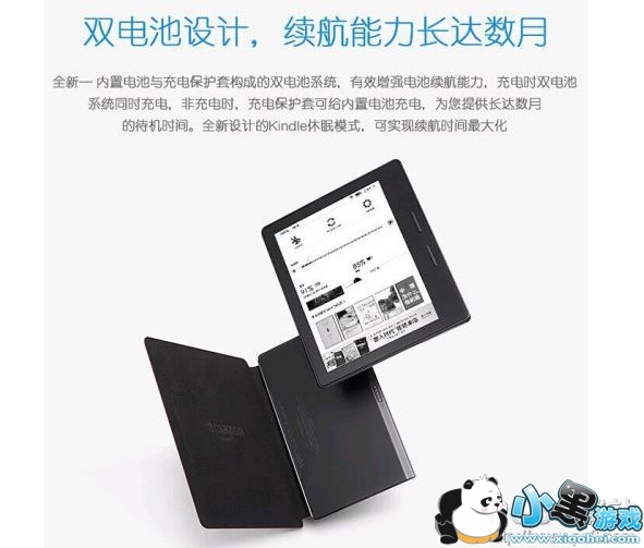 产品整体设计并不是完全对称的,有一边偏厚重,主要是电池和主要硬件安放在这一区域,因为加入了重力感应装置,所以无论是左手持握还是右手持握都可以。另外,还配备了双电池设计内置电池和保护套当中的电池组合使用,可以让Kindle Oasis实现数月待机时间。