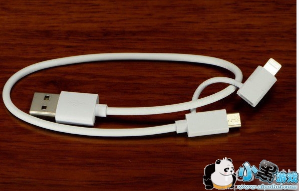 左边第一个接口是 USB-A 输出接口,第二个接口是 Micro USB 接口,Micro USB 右侧有四个电量指示灯,指示灯右侧是一个开关。这是套装里面的 Micro USB 和 Lightning 双接口的数据线,品牌并不是紫米的,而是 TOPTURBO。长度为 30 厘米,兼容 iPod、iPhone、iPad。这就是 Micro USB 和 Lightning 双接口的数据线,做工不错。