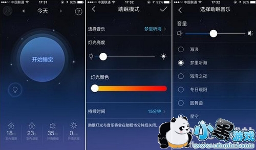 作为一款助眠灯,Nox最关键的体验自然是助眠,我首先体验了这个部分。在应用中可以找到助眠模式,这里可以进行多种自定义设置,包括音乐、灯光颜色及亮度、持续时间等,我选择了个人最喜欢的舒缓的海浪加上轻音乐“梦里听海”,将灯光颜色调节至最暗、最舒服的橙黄色。另外,在主屏幕上还可以看到室内温湿度、噪音水平、环境光的信息,这是得益于Nox内置的多种传感器,用户可以参考这些数据调整睡眠环境。