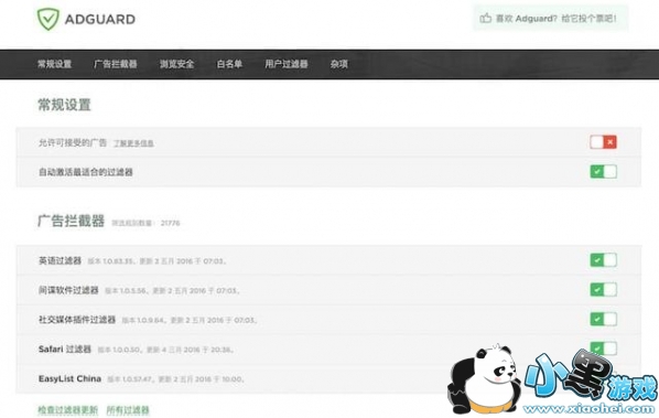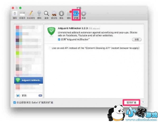 安装方法:打开 Safari 偏好设置(打开 Safari 按 command-,或者点击菜单“Safari -偏好设置”),点击“扩展-取得扩展”即可在 Safari 扩展插件页面看见 Adguard AdBlocker。
