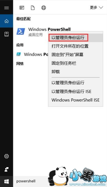 1、点击Cortana搜索框,输入powershell,在显示的结果中右击第一项,选择“以管理员身份运行”;