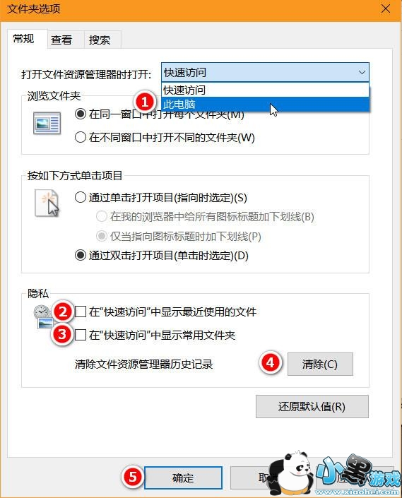 2、按照下图,依次选择“打开文件资源管理器时打开”此电脑,去除在“快速访问”中显示最近使用的文件与在“快速访问”中显示常用文件夹前面的对勾,并点击清除当前记录。最后点击确认或应用即可。