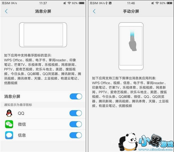 vivo X9分屏多任务,能让用户同时玩转2个应用,其包含了「消息分屏」和「手动分屏」2大功能,其中消息分屏,能够让视频、电子书、芒果TV、腾讯视频、优酷视频、土豆视频等APP中,悬浮图标显示QQ、微信、信息等应用;而手动分屏,在支持在这些应用中,三指下滑弹出消息。