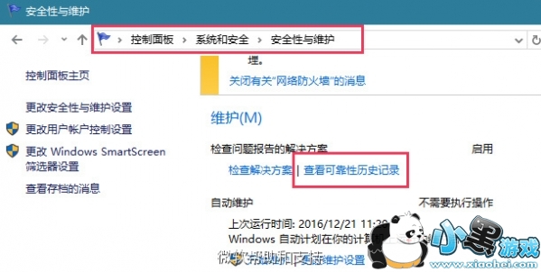 1. 依次打开【控制面板>系统和安全>安全性与维护】,然后找到【查看可靠性历史记录】;
