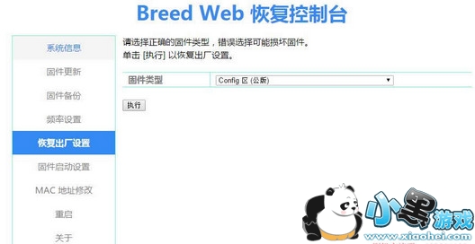 4、恢复固件之前最好在Breed Web恢复控制台恢复一下出厂设置,固件类型:Config区(公版),如下图。