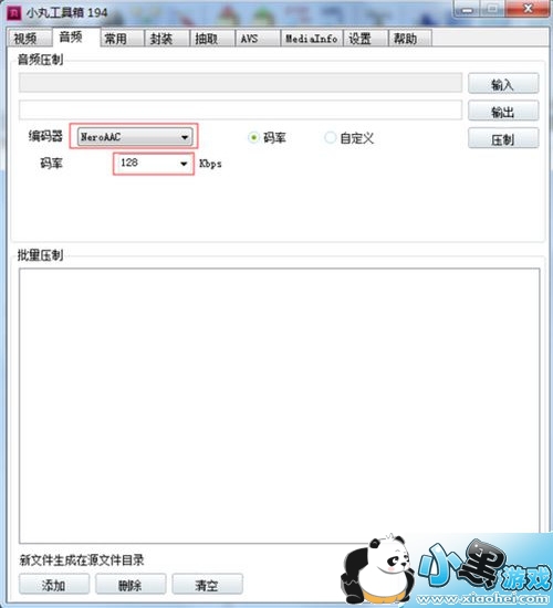 选择音频编码器(建议选NeroAAC)和码率(建议选128Kbps)