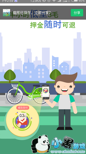 缴纳押金298,随时可退,按半小时3毛钱计费,算是最便宜的共享单车。