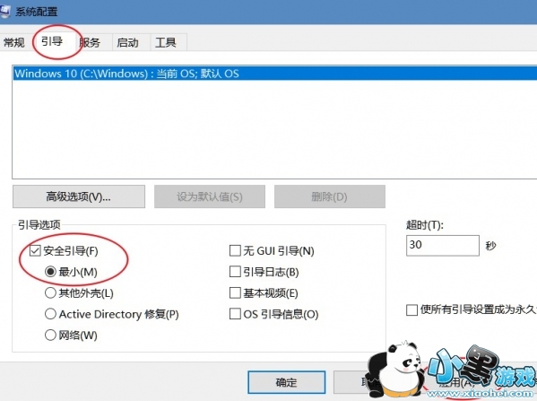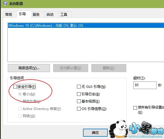 2、在打开的“系统配置”窗口中,选择“引导”,然后勾选“引导选项”中的“安全引导”,默认会选择“最小”,这时我们点击“应用”后确定,会弹出下面的窗口;