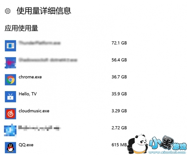 3、点击“使用量详细信息”后,需要几秒钟的加在过程,等待一会,你每款应用的流量消耗将逐一显示在窗口中。不过,对于桌面软件来说可能不会以软件的名字显示,但搭配左侧的软件图标,一般也不会有查看上的困难。