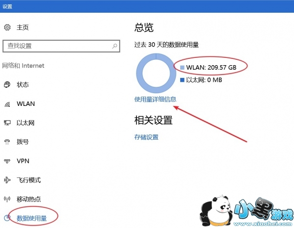 2、在“网络和Internet”界面的左侧,找到“数据使用量”,这时右侧就会显示你在30天内的数量使用总量了,如下图。如果你还使用了以太网连接的话,那么以太网的数据也会有变化。如果想要查看每款软件各自的数据消耗,点击“使用量详细信息”即可;