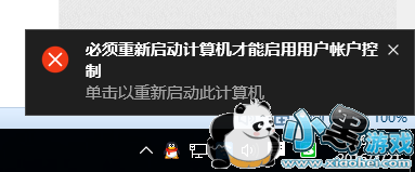 6.最后在桌面右下角将提示“必需重启计算机才能启用用户账户控制”窗口,之后重启一下电脑即可解决错误提示。