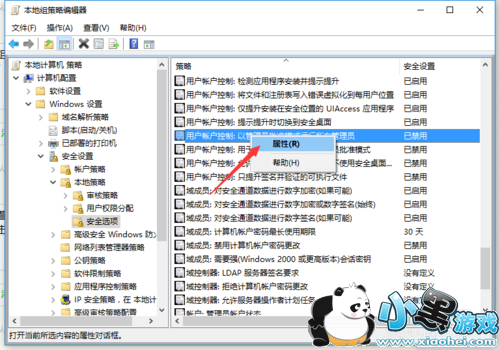4.接着在右侧找到“用户帐户控制:用于内置管理员账户的管理员批准模式”项并右击,从其右键菜单中选择“属性”项以打开“属性”窗口。