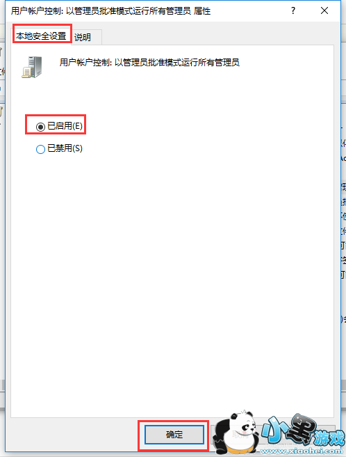 5.从打开的“用户帐户控制:用于内置管理员账户的管理员批准模式 属性”窗口中,将“本地安全策略”栏目中的“启用”项进行勾选,并点击“确定”以保存退出。