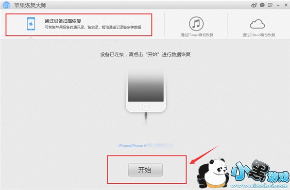运行苹果恢复大师,可以在软件界面上看到有【通过设别扫描恢复】、【通过iTunes备份恢复】和【通过iCloud备份恢复】三种不同的恢复方式,我们这边选择默认的第一模式进行iPhone微信记录的导出操作,那么当看到界面上显示的“设备已连接”之后就可以直接点击下方的【开始】进入微信数据的备份模式;