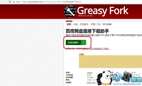 7、打开网址https://greasyfork.org/zh-CN/scripts/23635-百度网盘直接下载助手 ,点击安装此脚本,等待弹出对话框后点击安装即可把下载助手安装完成。