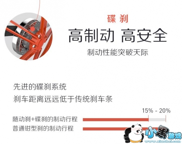 喜欢骑行的“老司机”都知道,碟刹是目前最先进、最安全的刹车系统。而新款摩拜单车配备了行业唯一碟刹系统,碟刹的刹停距离比传统刹车条缩短了15%~20%,且不会出现传统刹车条频繁使用后的“热衰减”现象,让骑行小橙车通勤、聚会、健身、短途游都更加安全,下坡、人流多的场景下,更加安全。