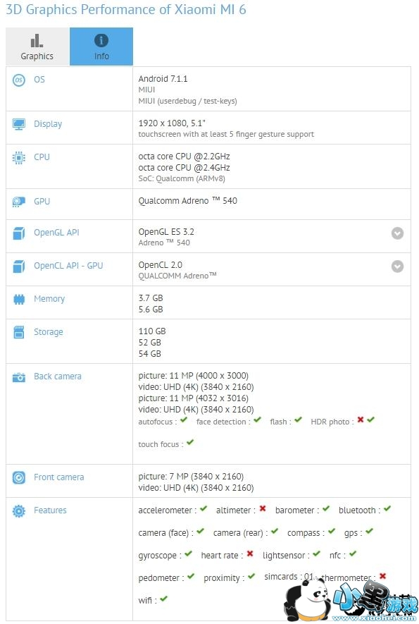 现在,小米6的全部配置参数已经出炉,从GFXBench显示的细节看,小米6配备的是5.1英寸1080p屏,搭载的是满血版骁龙835处理器,内存组合是4GB RAM+64GB存储(还有6GB RAM+128GB存储可选),运行Android 7.1.1系统。