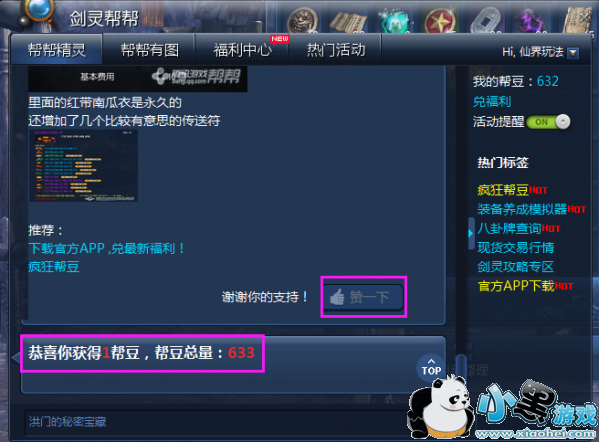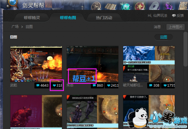 进入剑灵帮帮——帮帮有图,选择一个图进去点赞就可以获得1帮豆