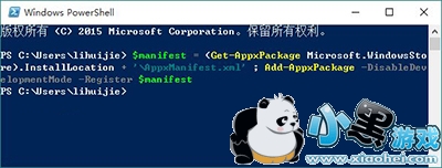 $manifest = (Get-AppxPackage Microsoft.WindowsStore).InstallLocation + ‘/AppxManifest.xml’ ; Add-AppxPackage -DisableDevelopmentMode -Register $manifest
