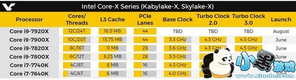 i9-7820X:8核心、16线程,三级缓存11MB,28条PCI-E通道,默认主频3.6GHz,Turbo 2.0睿频加速可到4.3GHz,Turbo 3.0最高4.5GHz,6月份发布。