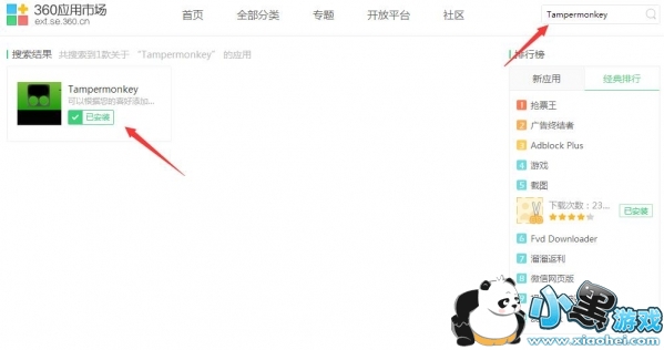 1、打开360浏览器的插件扩展中心,然后直接搜索“Tampermonkey”: