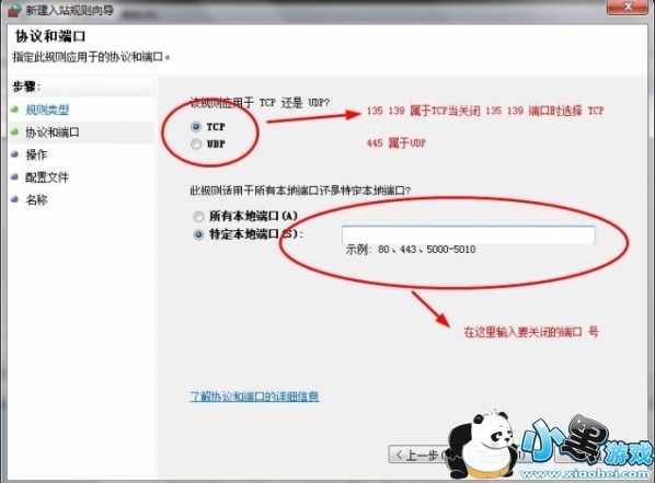 这里要关闭什么端口就输入到“特定本地端口”一次关一个,方法都是一样的。然后点击“下一步”。