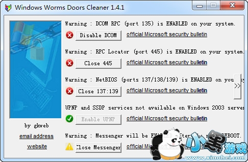 WIN732位下打开时会出现个错误窗口,关掉就好,然后出来界面,如果提示红色就是端口是打开状态,点关闭就好!【右边竖着的窗口会显示本机打开的端口,如果本机开启了135 445等端口会出现在右侧列表里的】