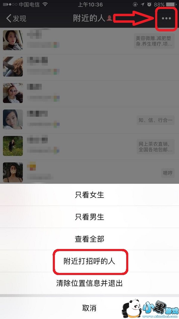 - 3、如果其他的人看不到自己,可以点击右上角【···】按钮并点击查看【附近打招呼的人】;