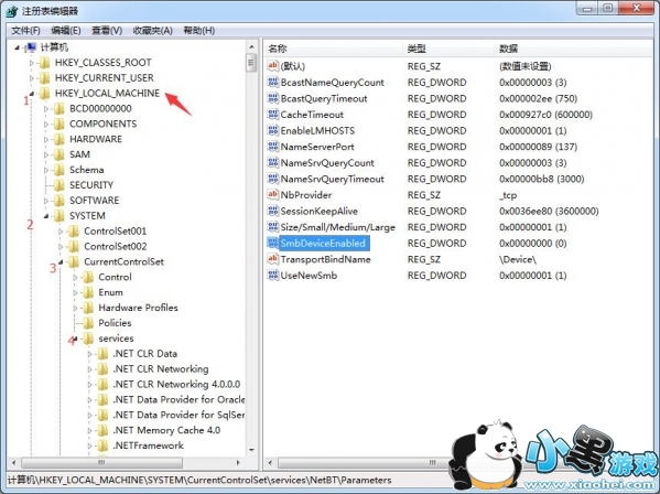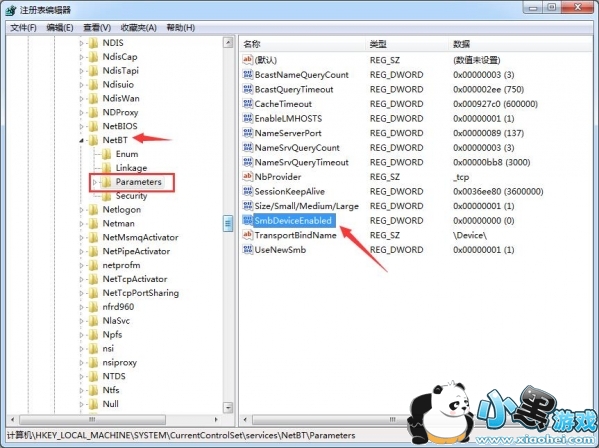 2、依次打开目录HKEY_LOCAL_MACHINE/System/CurrentControlSet/Services/NetBT/Parameters