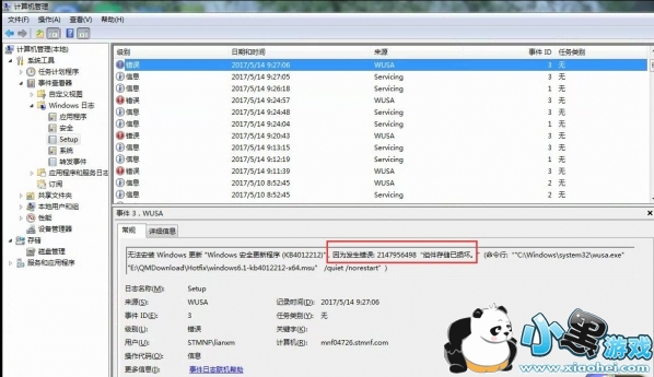 3、依次打开:计算机管理-->事件查看器-->setup-->看错误信息提示(来源是WUSA)-->如果错误提示信息中有如下提示的:无法安装 Windows 更新"Windows 安全更新程序 (KB4012212)",因为发生错误:2147956498“组件存储已损坏”(如下图),则继续步骤4