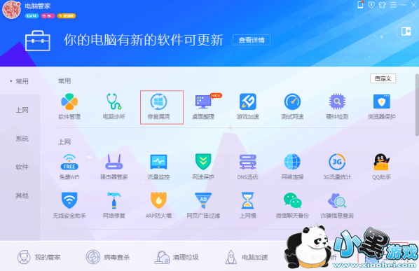 在管家主界面点击-->工具箱-->修复漏洞进入修复漏洞页面