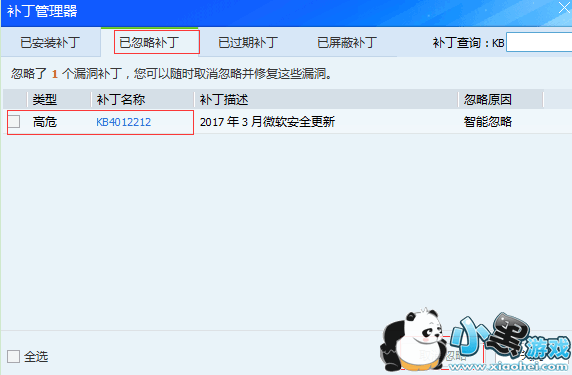 在修复漏洞页面点-->已忽略,进入补丁管理器页面,在补丁管理器页面点-->已忽略补丁-->选中kb4012212,点击取消忽略按钮
