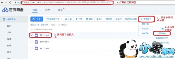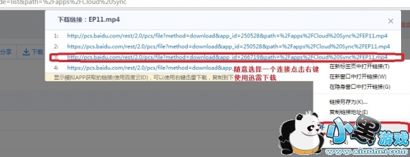 8、接下来给大家讲解怎么使用,如果是需要下载自己的文件,进入pan.baidu.com找到文件,可以看到右侧有一个下载助手按钮(如果分享的连接直接在上面按钮的最后,选择显示链接然后使用迅雷下载即可),鼠标放上去后会出现三个选项,推荐使用API下载,在API下载下点击显示链接,便可以显示出下载的连接,选择一个链接点击右键使用迅雷下载即可。